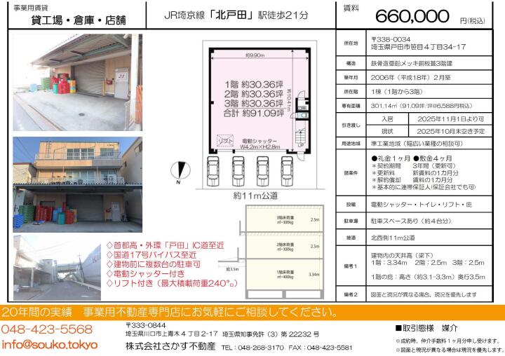 戸田市笹目4丁目 3階建て倉庫 91坪