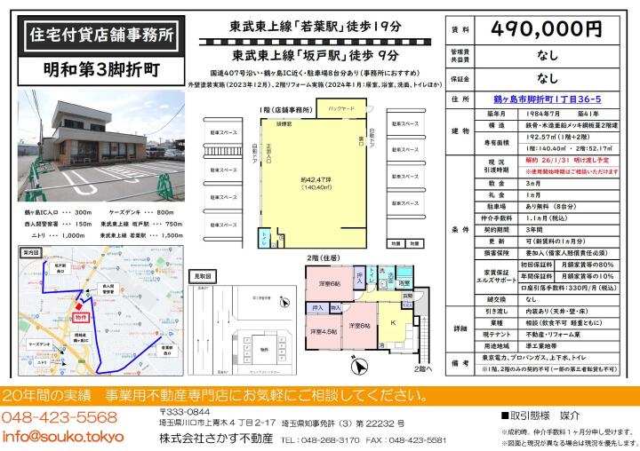 物件名 | 住宅付貸店舗事務所 明和第3脚折町 埼玉県鶴ヶ島市脚折町1丁目36−5 | ||
