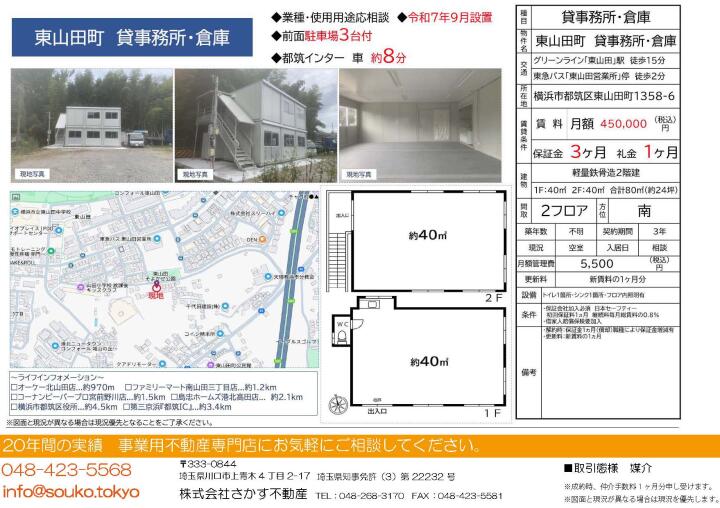 物件名 | 貸倉庫・事務所 神奈川県横浜市都筑区東山田町1358 | ||