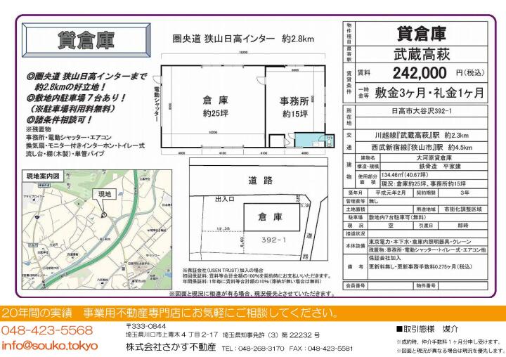 物件名 | 日高市高萩倉庫 埼玉県日高市大字大谷沢392-1 | ||