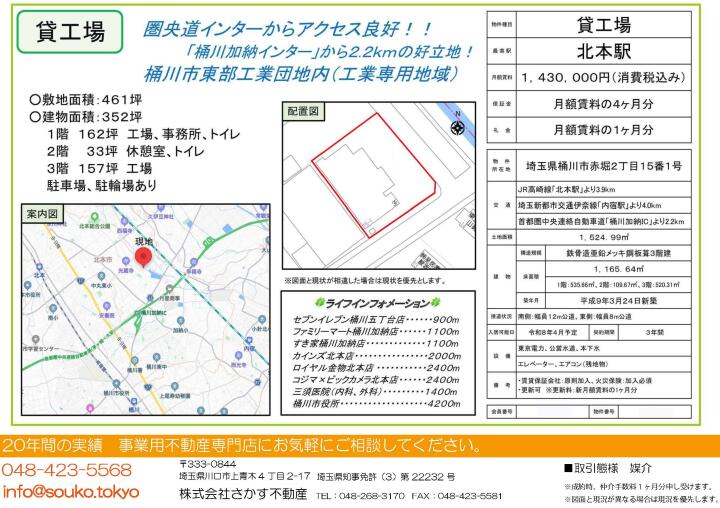 桶川市赤堀2丁目 3階建て工場・事務所 352坪