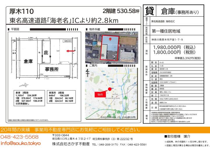 厚木市戸室1丁目 2階建て倉庫・事務所 530坪