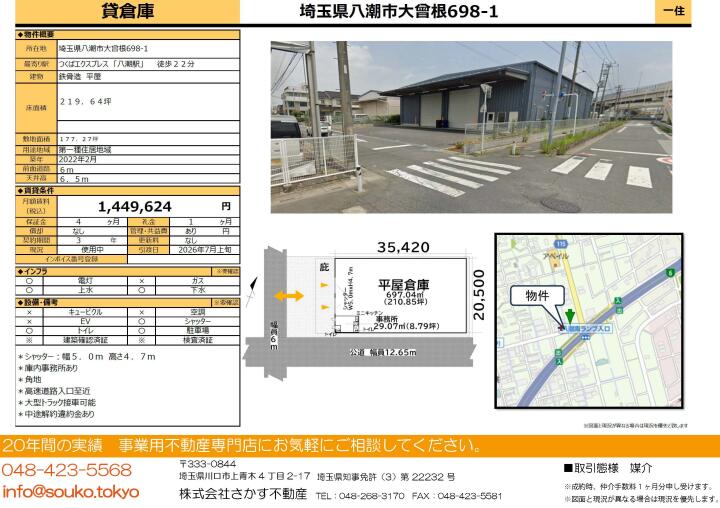 | 物件名 | 大曽根591倉庫 埼玉県八潮市大字大曽根698-1 | ||