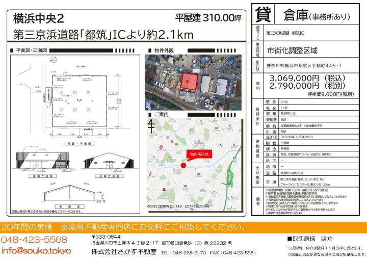 | 物件名 | 貸倉庫・事務所 神奈川県横浜市都筑区大棚町445-1 | ||