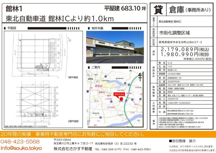 | 物件名 | 館林1倉庫 群馬県館林市赤生田町657-3 | ||