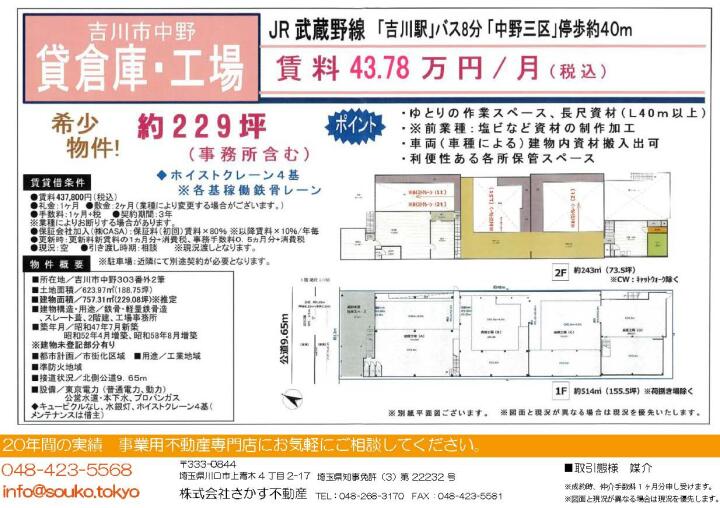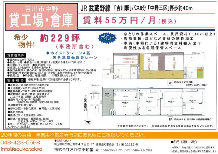 | 物件名 | 貸工場 埼玉県吉川市中野303 | ||