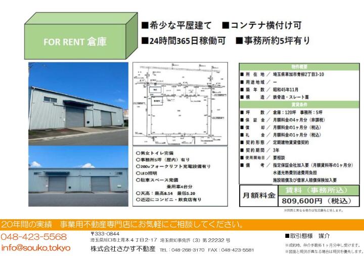 草加市青柳 倉庫約120坪+事務所約5坪