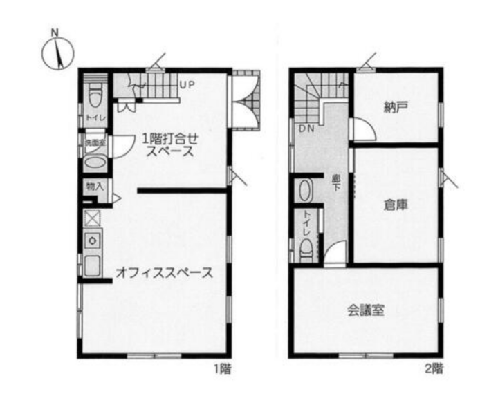 ・1階(約39m²)は打ち合わせスペースや受付、2階(約39m²)はオフィスや会議室として利用可能です