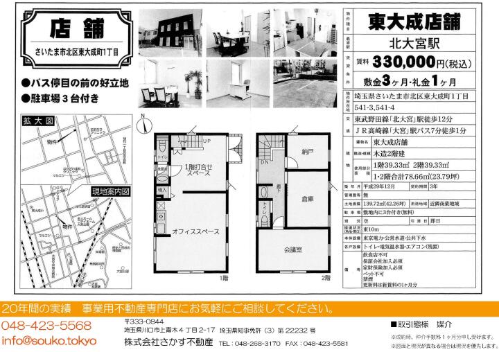 | 物件名 | 店舗事務所 埼玉県さいたま市北区東大成町1丁目541-3 | ||