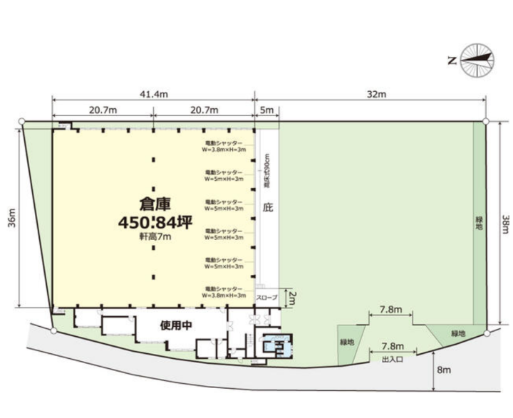 ・建物面積約450坪(1490.40m²)、鉄骨造平屋建ての大型倉庫