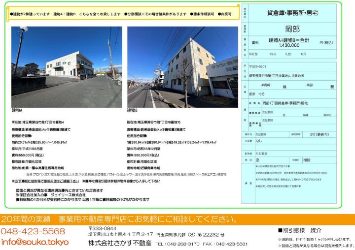 | 物件名 | 貸倉庫 貸事務所 埼玉県深谷市岡1丁目18番地4 | ||