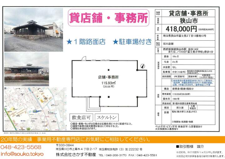 【埼玉県狭山市・貸店舗/事務所】41.8万円!車での集客に強い物件🏠