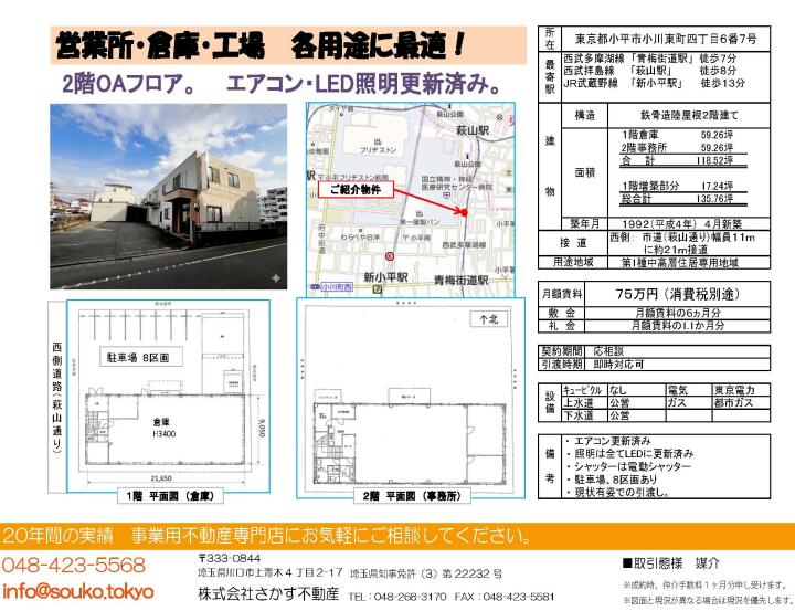 | 物件名 | 営業所・倉庫 東京都小平市小川東町4丁目6-7 | ||