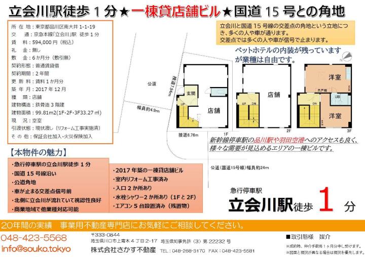 立会川駅徒歩1分!国道15号交差点角地の目立つ一棟貸し店舗ビル