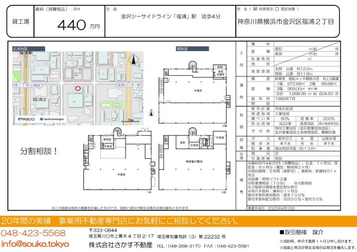 | 物件名 | 貸工場 神奈川県横浜市金沢区福浦2丁目9-1 | ||