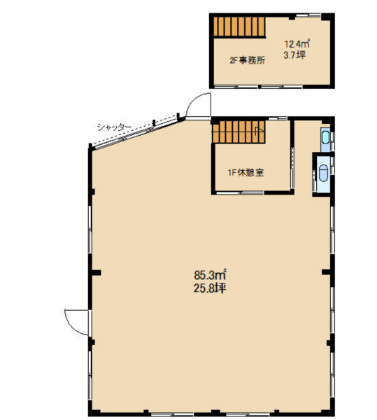 専有面積は約29.55坪。室内に約3.7坪の2階事務所と1階休憩室を備えており、現場と事務を効率的に集約可能です🚗