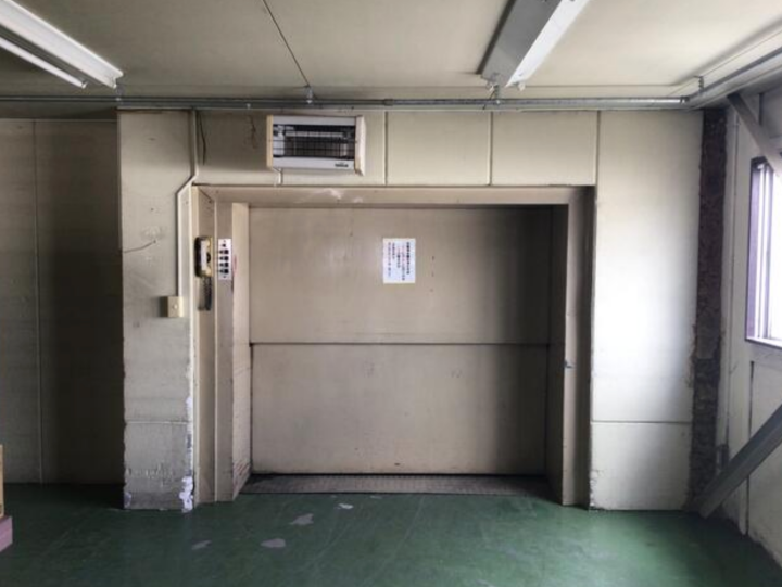 建物3階部分の約63.34坪。最大の特徴は950kg積載の貨物用エレベーターと、2か所の電動シャッターです🚗