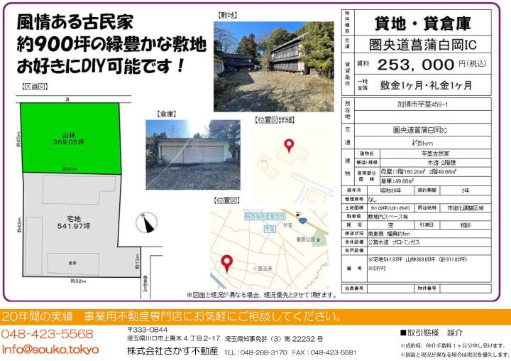 加須市芋茎エリア。圏央道「菖蒲白岡IC」より約5km。風情ある古民家と実用的な倉庫、そして圧倒的な広さを誇る敷地がセットになった希少物件です!