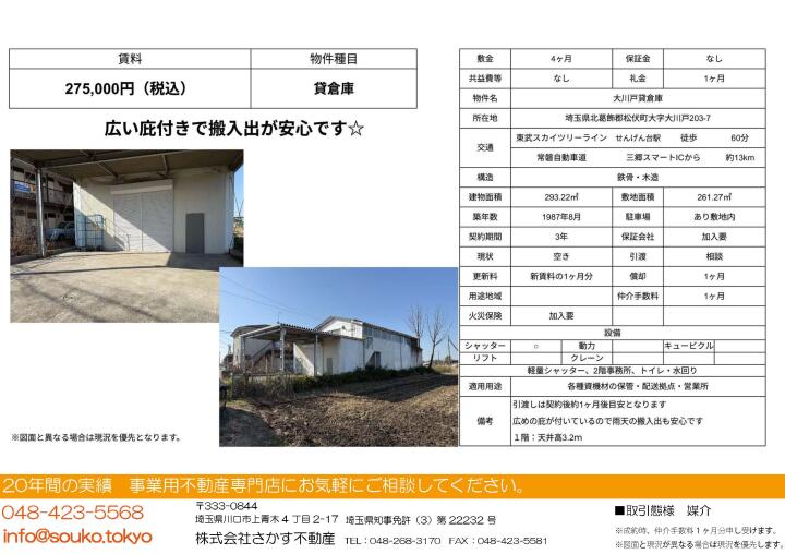 | 物件名 | 大川戸貸倉庫 埼玉県北葛飾郡松伏町大字大川戸203-7 | ||