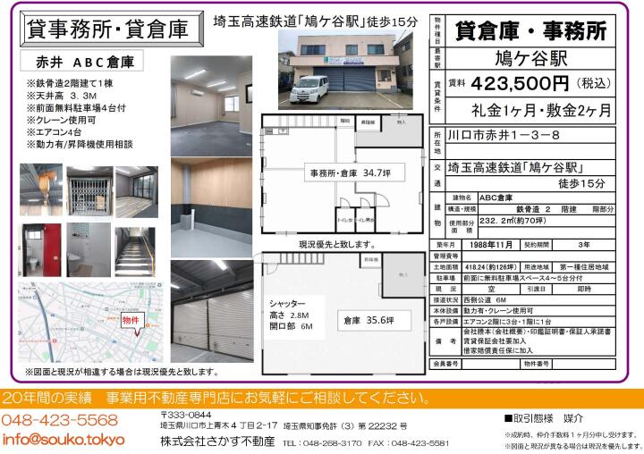 | 物件名 | ABC倉庫 埼玉県川口市赤井1丁目3-8 | ||