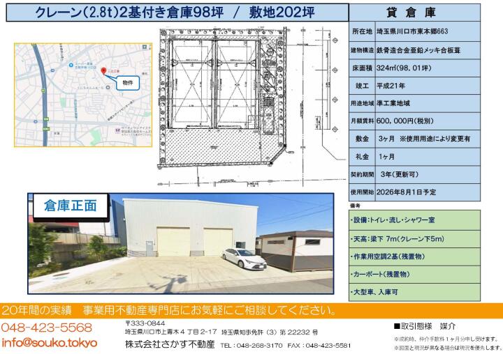 【埼玉県川口市・貸倉庫】600,000円(税別)!2基の2.8tクレーンと空調設備がビジネスを加速させる、98坪の戦略的一括拠点🏠