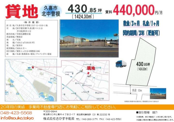 430坪の広大な宅地!インフラ完備・大型車OKの久喜北中曽根貸地