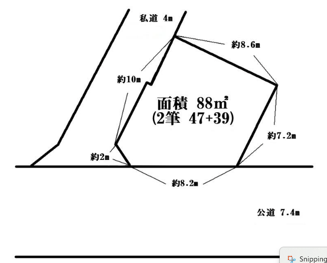 26坪の角地!資材置場・一括駐車場に最適な南側7.4m道路面