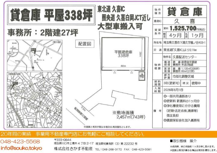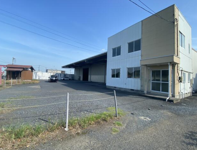 東北道「久喜IC」よりわずか2.1km、幅員9.3mの県道に面した大型車両の運用に最適な立地です。鉄骨造平屋建倉庫1,120m²(338.80坪)と別棟事務所89m²(26.92坪)の構成です。