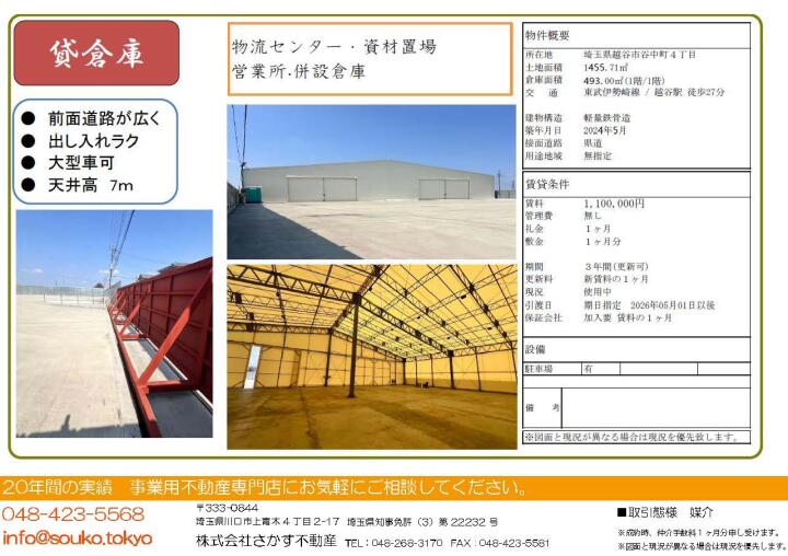 | 物件名 | 越谷市谷中町4丁目 貸倉庫・営業所 埼玉県越谷市谷中町4丁目 | ||