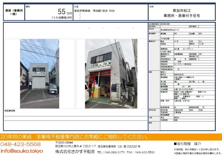 | 物件名 | 草加市松江 倉庫 事務所・住居付き 埼玉県草加市松江6丁目1-3 | ||