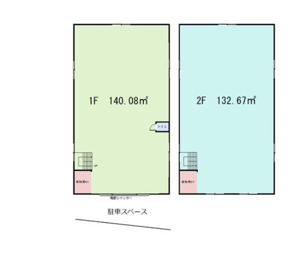 荷物用エレベーター(EV)により上下階の荷揚げも容易。前面には自動シャッターを装備し、敷地内に約2台分の無料駐車スペースも完備しています。