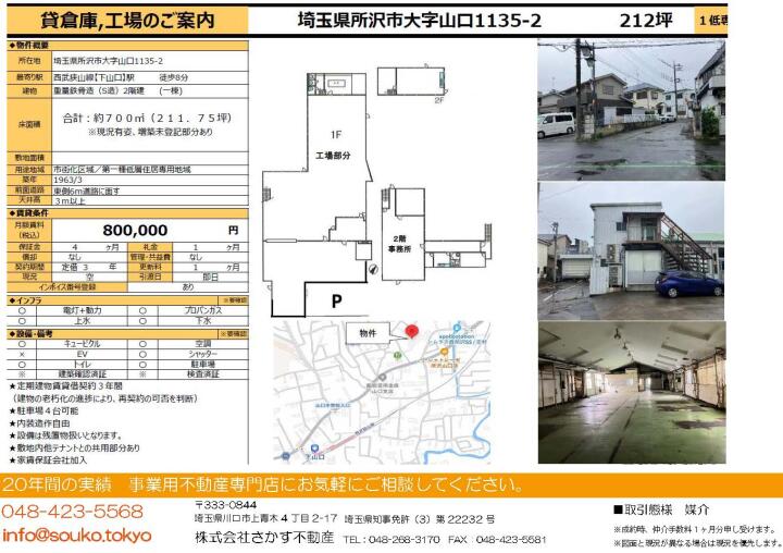 | 物件名 | 所沢市大字山口 貸倉庫・工場 埼玉県所沢市大字山口1135-2 | ||