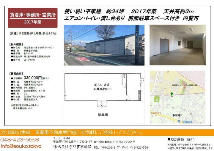 | 物件名 | 志木市下宗岡3丁目 貸倉庫・事務所 埼玉県志木市下宗岡3丁目16−21 | ||