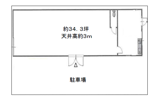 ・設備:天井高約3m、エアコン、トイレ、流し台、シャッター、前面駐車スペース