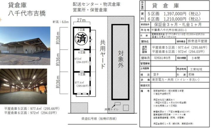 ・主要設備:軒高6.0m、共用ヤード、東京電力、共用トイレ、駐車場有り