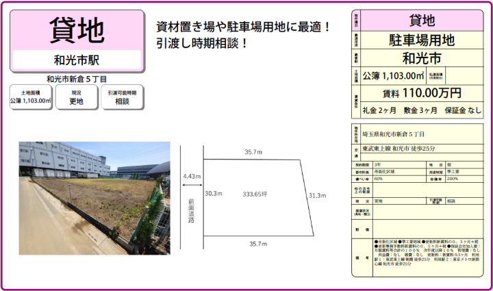 | 物件名 | 和光市新倉5丁目貸地 埼玉県和光市新倉5丁目 | ||