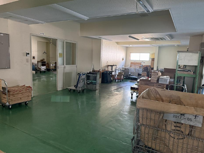 作業所部分と倉庫部分が約100m離れているため、棟間を頻繁に行き来する場合は車両や台車による移動の考慮が必要です。