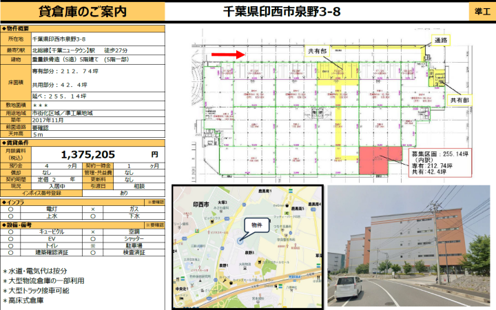 | 物件名 | 千葉県印西市泉野3丁目8 貸倉庫(大型物流倉庫5階一部) | ||