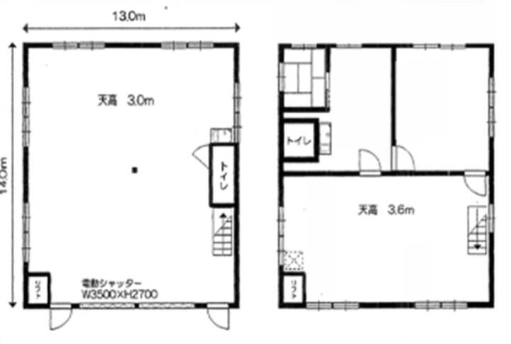 ・設備:電動シャッター(W3500×H2700)、リフト・キュービクル(残置物)、トイレ、駐車場有